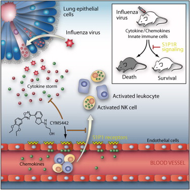 利用遗传学和化学手段研究细胞表面受体S1P1,他们意外地发现当控制血管壁内皮细胞的S1P1受体时,会影响细胞因子的释放。而之前科学家猜想细胞因子释放是通过位于肺部的受病毒侵染细胞发生的。