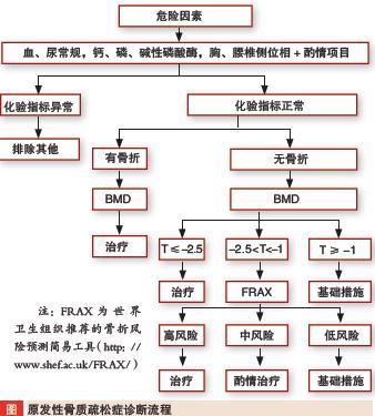 为了能够更好地规范临床骨质疏松症的诊治,2011 年年初中华医学会骨质疏松和骨矿盐疾病分会发布了《原发性骨质疏松症临床诊疗指南》,诊断流程见表。北京协和医院徐苓教授指出,这一指南是临床医生的“GPS”,鲜明地表达了“上医治未病”的观念,对于无骨折发生而存在骨折高风险人群应该充分关注,加强防治。调整生活方式(营养、运动、阳光等)、应用骨健康基本补充剂(钙、维生素D)、预防跌倒是最为基础的防治措施。