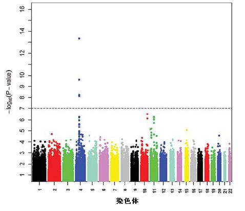 他们对2396个病例和2105个对照的基因组上的593253个突变位点进行了25羟基维他命D循环水平的关联分析,统计分析结果如图1所示。他们发现位于4号染色体的突变位点rs22582679与25羟基维他命D的循环水平有关联 (p-value=2×10-30); 而且他们还发现另外三个突变位点: rs3829251 (p-value=8.8×10-7),rs6599638 (p-value=3.3×10-7),rs2060793 (p-value=1.4×10-5)也有可能与25羟基维他命D的循环水平也有关联。
