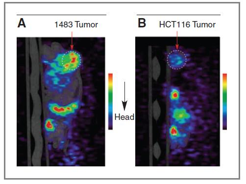结果显示18-F化合物富集于发生炎症反应的大鼠足部,而未发生炎症反应的大鼠足部检测不到,且与处理celecoxib会阻断该信号的检测。在COX-2表达阳性和COX-2表达阴性的人类肿瘤中,18-F化合物仅富集于COX-2阳性的肿瘤中。