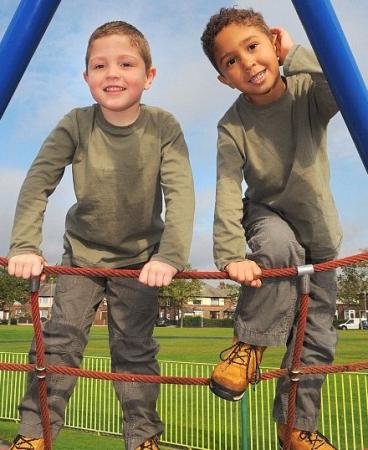 你也许感觉到奇观,两个小家伙虽然穿着相同款式的衣服,不过一眼看过去,别说双胞胎,他们看上去连兄弟都不像。可事实上,他们竟然是双胞胎,他们早就上了当地报纸的头条,因为一个是白皮肤另一个是黑皮肤。
