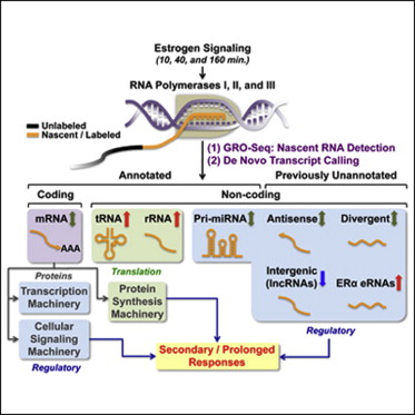 在这篇文章中,研究人员利用一项叫GRO-seq(Global Run-On Sequencing)测序技术,并通过一种新的生物信息学方法来分析数据,发现雌激素信号能快速,有力,并以一种出乎预料的短暂方式直接调节很大部分的转录谱。除编码蛋白的基因外,雌激素还调控了全部三种RNA聚合酶的分布和活性,事实上还包含迄今为止所有描述过的每一类非编码RNA,研究人员还首次发现数千种以往未注明或未检测到的由雌激素调节的基因间转录,为进一步研究开辟了新的方向。这为引发细胞分裂的雌激素依赖作用提供了一个有关的更广的基因调解谱图。