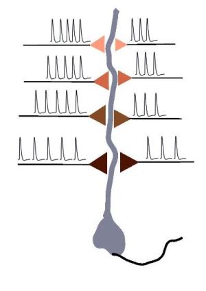 图片表示具有树干状树状突起的神经元。每个接触树状突起的三角形代表一个突触,其中来自其他神经元的信号叫脉冲。树状突起上的突触离细胞体越远,脉冲频率要求越高。