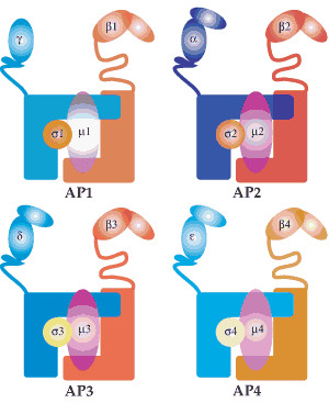 四种衔接蛋白(Adaptor protein)复合体结构模拟图。相同颜色表示该亚基具有显著同源性。