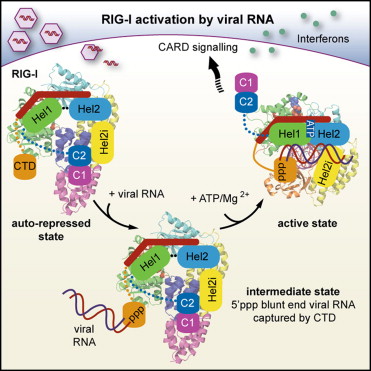 在病毒感染的应答中,RIG-I识别病毒的遗传物质(具体来说是病毒RNA),并激活细胞合成关键的抗病毒分子—干扰素。干扰素分泌后被周围细胞接受,引起它们表达数百个抗感染基因。为了理解RIG-I如何仅感知病毒RNA(而非细胞自身的RNA)并发出警报,科学家利用X射线晶体成像技术确定了分别在有无病毒RNA时RIG-I的3维原子结构。