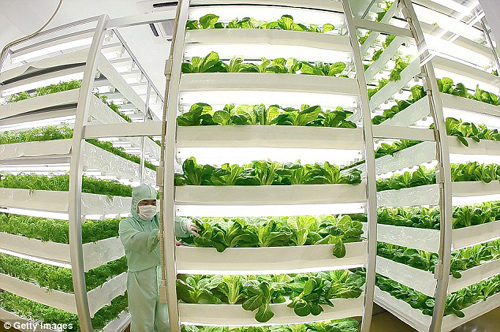 “完全不用阳光”,在每个栽培架上,都装有一块灯板。不同的是左侧是LED(发光二极管)灯,右侧是荧光灯。两种灯光都能满足植物生长的需要,只是LED比荧光灯更加节能。 LED灯板以红灯为主,中间按一定距离均匀分布着蓝灯,比例大概为8∶1到9∶1,太阳光对于植物而言是全波段的,红光、蓝光、紫外线、红外线等都包括,但实验显示,植物吸收的光线波段主要是红光和蓝光,比例超过60%。因此将红光和蓝光按照一定配比制成光源,就能满足植物生长需求。红外和远红外等成分主要以热量的形式出现,而且耗能严重。去掉那些部分,不会影响植物品质。他们做过实验,这种环境下成长起来的植物,维生素和糖的含量几乎没有变化。由于植物工厂内环境可控性强,栽培环境的二氧化碳浓度可以得到大幅增加,使植物的光合效率提高,植物生物量的形成和营养物质的积累,都是常规栽培的几倍。