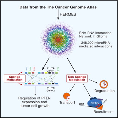 By analyzing gene expression data in glioblastoma in combination with matched microRNA profiles, we have uncovered a posttranscriptional regulation layer of surprising magnitude, comprising more than 248,000 microRNA (miR)-mediated interactions. These include ∼7,000 genes whose transcripts act as miR “sponges” and 148 genes that act through alternative, nonsponge interactions. Biochemical analyses in cell lines confirmed that this network regulates established drivers of tumor initiation and subtype implementation, including PTEN, PDGFRA, RB1, VEGFA, STAT3, and RUNX1, suggesting that these interactions mediate crosstalk between canonical oncogenic pathways. siRNA silencing of 13 miR-mediated PTEN regulators, whose locus deletions are predictive of PTEN expression variability, was sufficient to downregulate PTEN in a 3′UTR-dependent manner and to increase tumor cell growth rates. Thus, miR-mediated interactions provide a mechanistic, experimentally validated rationale for the loss of PTEN expression in a large number of glioma samples with an intact PTEN locus.