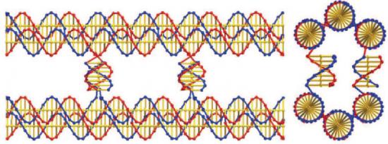 此次研究的突破在于成功复制了包含复杂信息的DNA系统。研究人员首先从人造DNA模片开始,这是DNA的细小排列。DNA的腺嘌呤(A)和胸腺嘧啶(T)、鸟嘌呤(G)和胞嘧啶(C)互相结对形成人们熟悉的双螺旋结构。研究人员制成了含有3个DNA双螺旋结构的弯曲三螺旋分子(BTX)。每个BTX分子由10个DNA索烃构成,与DNA不同的是,BTX的编码不局限于4个字母,它能够包含108个不同字母和模片,借助4个DNA单索的互补形成一对,或在每个模片上形成“黏性末端”,直至构成最终的6个螺旋束(six-helix bundle)。