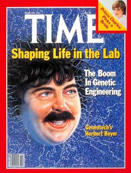 Herbert Boyer 同学看起来很不起眼——和英俊 Paul Berg 同志相差不可以道理计——Boyer 同学是一个典型的科学家造型,肥胖,并留着十分混沌的发型和胡子。以下是他被大幅美化过之后的造型:(右上角的美女是不是很眼熟?没错,那是戴安娜王妃。Boyer 同学上 TIMES 封面的时候,王妃还只是配角。)