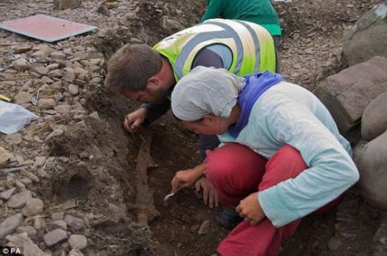 船棺挖掘现场,奥利弗-哈里斯博士与另一名考古学家正在检查佩剑。(图)