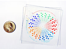 滑片和载片:这一微流体装置在这里显示,被称为滑片芯片(SlipChip),它包含两个载片,载片上印有电位,具有可变容量,这就可以测量分子,浓度范围很大。在这里,有一个芯片用于分析5种不同的样品,呈现为不同的颜色。