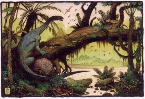 恐龙Glacialisaurus hammeri生活在1.9亿年前,栖息地是现在的南极洲。这张图片以几只翼龙目动物和一只像哺乳动物的小型爬虫动物为背景。当时南极陆地跟其他大陆相连,气候并没有现在那么恶劣。