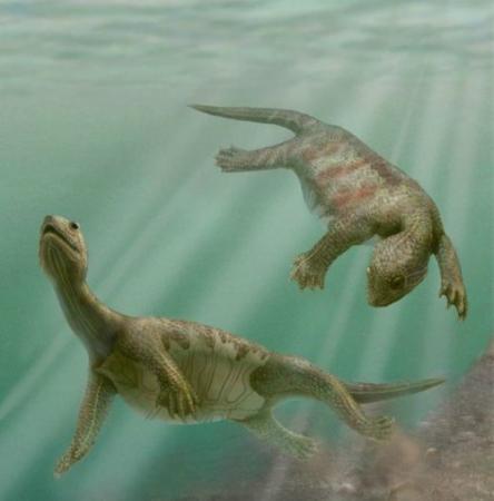 这种生活在距今2.2亿年前中国沿海的半壳龟(Odontochelys semitestacea)是迄今已知最古老的龟类。它的腹部有龟壳,但背部基本上没有任何保护。