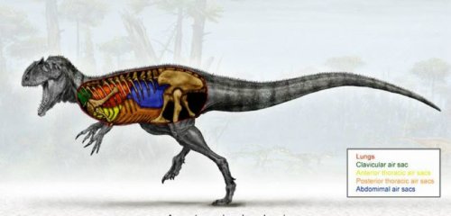 这张图是对远古食肉动物气腔龙的生动呈现。气腔龙可能生活在距今8500万年前,图中,红色代表肺,其他颜色则代表气囊。根据对气腔龙化石的最新分析,这头体型庞大的食肉恐龙的呼吸系统与当今的鸟类有诸多类似之处,进一步强化了恐龙和现代鸟类在进化上存在联系的理论。