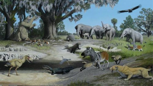 最新研究表明,在连接南美和北美两个大陆的大陆桥形成以前,一种7英尺(约合2米)高的史前鸟类从南美抵达北美。科学家猜测,这种食肉性鸟类不能飞行,头部大的与身体不成比例,可能经由一系列岛屿(这些岛屿后来形成了今天的巴拿马地峡)到达北美。本图是对距今大约200万年前北佛罗里达州动物群落的艺术想象图。图中左侧底部便是“恐怖鸟”。