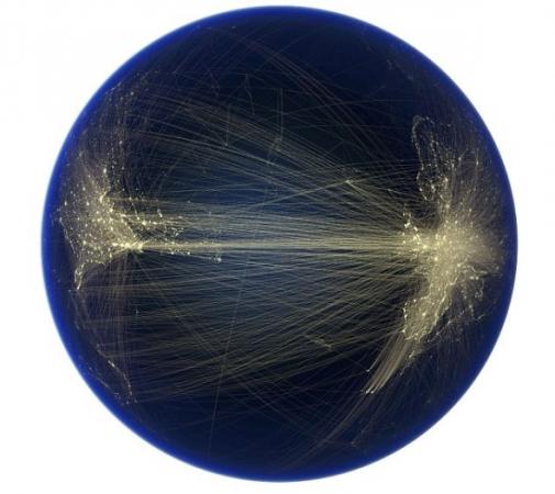 北京时间10月24日消息,加拿大人类学家费里克斯-菲兰德利用13年时间绘制出一幅幅令人惊异的图像,展现数据同步传输电缆、飞机和公路等人类技术如何在地球表面“殖民”。图像中,大量金色线在暗淡的地球上延伸,形成一个生动的蜘蛛网,展现人类技术如何影响地球。