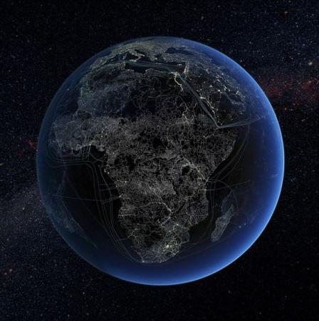 夜色下的非洲,展示了公路、铁路、数据传输线路以及连接大陆的海底数据电缆等人类技术。(图)