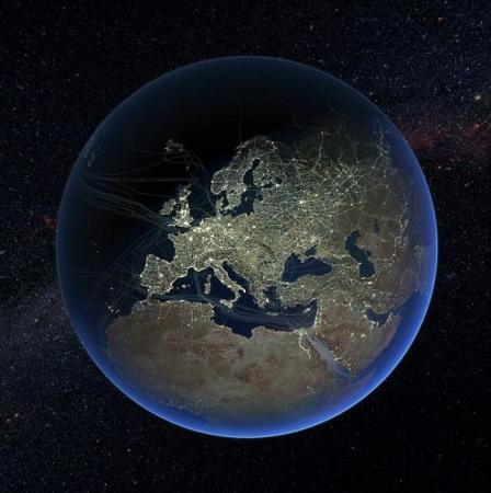 加拿大人类学家费里克斯-菲兰德绘制的地球图像,展现了大型公路、铁路网、输电线路和海底电缆。菲兰德通过将真实数据添加到夜晚拍摄的城市卫星照片上绘制出这幅图像。(图)