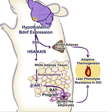 Living in an enriched environment with complex physical and social stimulation leads to improved cognitive and metabolic health. In white fat, enrichment induced the upregulation of the brown fat cell fate determining gene Prdm16, brown fat-specific markers, and genes involved in thermogenesis and β-adrenergic signaling. Moreover, pockets of cells with prototypical brown fat morphology and high UCP1 levels were observed in the white fat of enriched mice associated with resistance to diet-induced obesity. Hypothalamic overexpression of BDNF reproduced the enrichment-associated activation of the brown fat gene program and lean phenotype. Inhibition of BDNF signaling by genetic knockout or dominant-negative trkB reversed this phenotype. Our genetic and pharmacologic data suggest a mechanism whereby induction of hypothalamic BDNF expression in response to environmental stimuli leads to selective sympathoneural modulation of white fat to induce browning and increased energy dissipation.