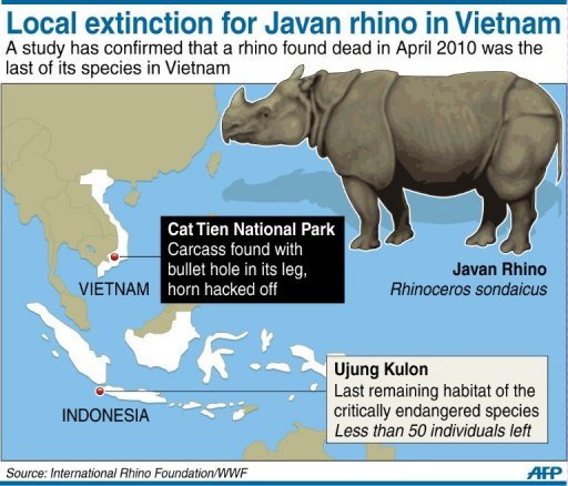 世界野生动物基金会一份最新研究报告声称,2010年4月死亡的爪哇犀牛是越南最后一头爪哇犀牛