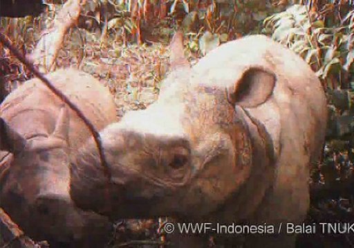 2010年11月22日,世界野生动物基金会的监测相机在印尼乌戎格库龙国家公园犀牛保护区内拍摄到一头爪哇犀牛和它的孩子