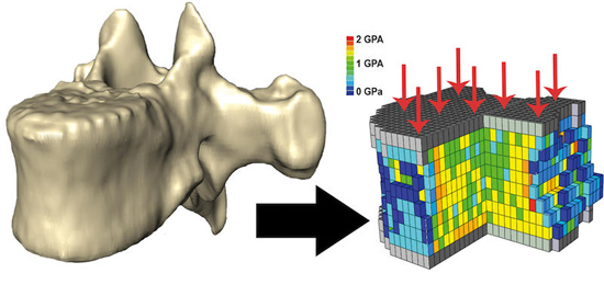 图:生物力学模型测量骨骼强度,三维椎骨模型转化为生物力学模型(左),有限元模型中不同的色彩代表不同的骨密度与骨弹性(右)