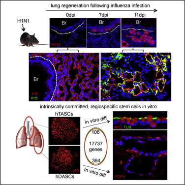 研究人员从人体不同区域分离出了3种干细胞:远端干细胞、气管干细胞和鼻上皮干细胞,并进行克隆培养。结果他们发现尽管这些干细胞的相似度高达99%,但只有能表达p63的远端干细胞最后分化出了新的肺泡。