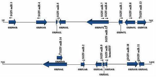 MicroRNAs (miRNAs) are ubiquitous non-coding RNAs that regulate gene expression at the post-transcriptional level. An increasing number of studies has revealed that viruses can also encode miRNAs, which are proposed to be involved in viral replication and persistence, cell-mediated antiviral immune response, angiogenesis, and cell cycle regulation. Singapore grouper iridovirus (SGIV) is a pathogenic iridovirus that has severely affected grouper aquaculture in China and Southeast Asia. Comprehensive knowledge about the related miRNAs during SGIV infection is helpful for understanding the infection and the pathogenic mechanisms.