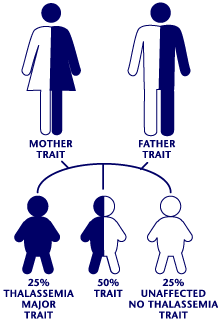 地中海贫血症有隐性、轻度和重度之分。重度患者通常不能存活;而两个隐性或轻度患者结婚,他们的下一代则有1/4机会患有重度地中海贫血症。相反地,两者中只有一位是存有地中海贫血症基因的话,不论程度如何,则下一代没有此问题或只带有隐性。