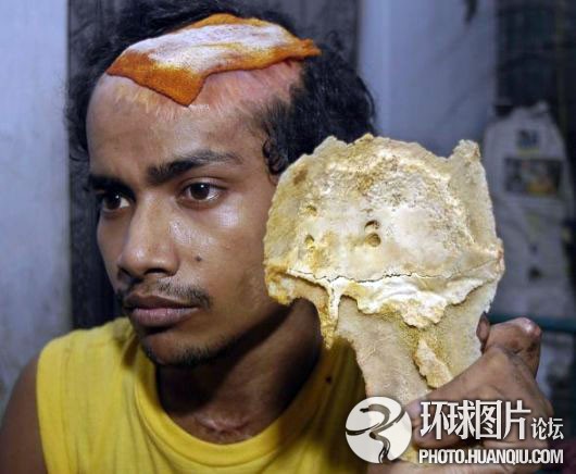 2006年7月,印度加尔各答市一名25岁电工由于遭遇触电烧伤,导致头部一块头盖骨坏死,从脑袋上脱落了下来。这名男子手捧自己的头盖骨的“奇景”顿时使他成了当地名人,数百名市民纷纷拥向他接受治疗的加尔各答市医院,参观这个“手捧自己头盖骨”的奇人。