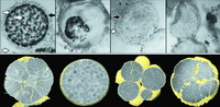 利用来自一部同步加速器的X射线,研究人员获得了死亡硫珠菌、死亡海胆胚胎,以及一些原始陡山沱化石的三维图像。他们在12月6日的英国《皇家学会学报B》上报告说,部分死亡和完全死亡的细菌图像看起来与著名的化石一点也不一样。首先,硫珠菌细胞在腐烂后变成了空球体,而陡山沱化石则表现出了大量内部结构的证据。