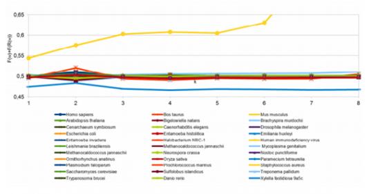 他们说,所研究的32个物种中,有30个物种相当精准地出现了这些模式,包括人类、大肠杆菌(e.coli)和植物拟南芥(arabidopsis)。只有人类免疫缺陷病毒(即艾滋病毒,HIV)和侵染桃树的苛养木杆菌(Xylella fastidiosa)9a5c的DNA与这类模式不一致。
