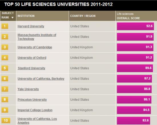 英国《The Times》每年都会发布世界大学排行榜,近期公布了最新(2011-2012年)各学科学术排行榜,主要的评点标准包括教学质量、科研论文引用情况、科研成果转化收入以及国际化程度等等,2011-2012年生命科学类荣登榜首的是美国哈佛大学,其次是麻省理工学院,以及剑桥大学。