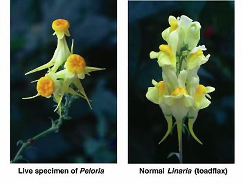 正常的柳穿鱼花(右)的左右对称由于基因“闭嘴”,变成了辐射对称的“章鱼花”(左)