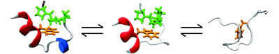 Eine neuartige Multisonden- und Multifrequenzmethode ermöglicht die Untersuchung der Faltungsdynamik individueller Proteinstrukturelemente. Ausgelöst durch einen Temperatursprung entfaltet sich die 310-Helix (blau im Bild) des Miniproteins Trp-cage vor der globalen Entfaltung des Proteins, während die Bildung der Käfigstruktur von der Faltung der α-Helix (rot) abhängt.