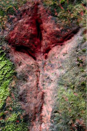 数年前,赤水市宝源乡,当地人一个小发现,让人们浮想联翩。在宝源乡的深山老林中,一些巨型岩石上有形状象鸡爪的脚印,村民们叫它“天鸡石”。上面的 “天鸡脚印”不仅每个脚迹的长、宽相等,而且脚迹之间的距离也几乎相等。2008年,青年恐龙学者邢立达应邀带队来此考察,判定这所谓的“天鸡脚印”就是地质处于内陆湖盆时期,一类肉食性兽脚类恐龙走过后留下的脚印化石。至于足迹形成的年代,根据孢粉分析,约处于白垩纪中晚期。
