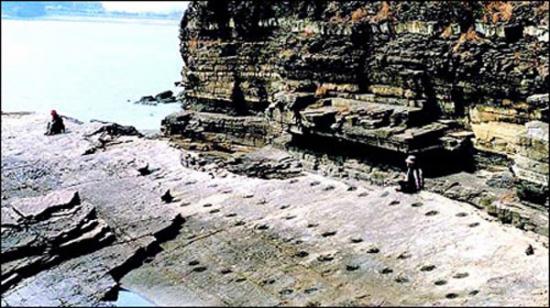 新发现的恐龙足迹化石时代可追溯到距今1.3到1.6亿年前的白垩纪时期,这比韩国过去所发现最古老的恐龙足迹化石要提早了一千到两千万年。这些足迹化石是属于肉食性恐龙的,尾部可长达3.6米,这也是韩国这类恐龙遗迹的首次发现。肉食性恐龙足迹化石长约23厘米,宽约16厘米,随同一起保存并被发现的还有其它植食性恐龙足迹化石和最古老的带蹼鸟类足迹化石以及一些其它植物化石。