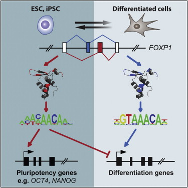 加拿大多伦多大学研究人员发现了进化上保守的特异的FOXP1选择性剪接开关,可调控干细胞的多能性。研究人员发现这种剪接开关产生的FOXP1胚胎干细胞特异性异构体,与典型的FOXP1异构体相比,着不同的DNA结合性质。选择性剪接事件改变了FOXP1胚胎干细胞特异性异构体的DNA结合性质,促进维持多能性所需的转录因子基因的表达,包括OCT4、NANOG、NR5A2和GDF3,同时抑制胚胎干细胞分化所需的基因。同时,研究小组还发现FOXP1胚胎干细胞特异性异构体促进体细胞高效重编程为诱导性多功能干细胞(iPSC)。