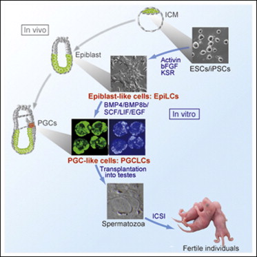 日本京都大学研究人员通过体外诱导胚胎干细胞(ESCs)和诱导性多功能干细胞(iPSCs),形成原始生殖细胞样细胞(primordial germ cell-like cells, PGCLCs),最后进一步分化,通过体内植入不能生育的小鼠睾丸中,产生了外观正常的精子。将这些精子注射到雌性小鼠的卵细胞中,不久雌性小鼠生出了健康的小鼠后代。