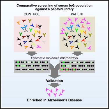美国研究人员利用一种一般性和无偏差的方法---组合文库筛选(Combinatorial Library Screening)来鉴定出诊断上有用的抗体,而避免进行抗原鉴定。该方法涉及利用非自然的合成分子组合文库对病人血清样品和对照样品进行比较性筛选,这样就可鉴定出病人血清样品中要比和对照样品中保留极其多IgG抗体的分子,随后利用这些分子作为捕获试剂来捕获诊断上有用的抗体。研究人员利用多发性硬化症(multiple sclerosis)小鼠模式动物和证实这种方法的实用性,并利用该方法在阿尔茨海默病小鼠模式动物中鉴定出两种候选的IgG抗体生物标记。