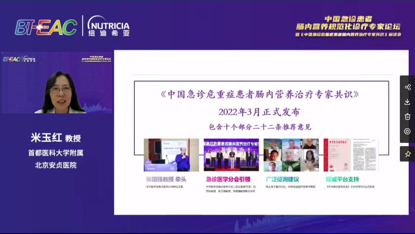 2022年5月27日,“无饥饿急诊”中国急诊患者肠内营养规范化诊疗专家论坛暨《中国急诊危重症患者肠内营养治疗专家共识》解读会在云端隆重举办。本次会议的主题为:“以《共识》促实践”。