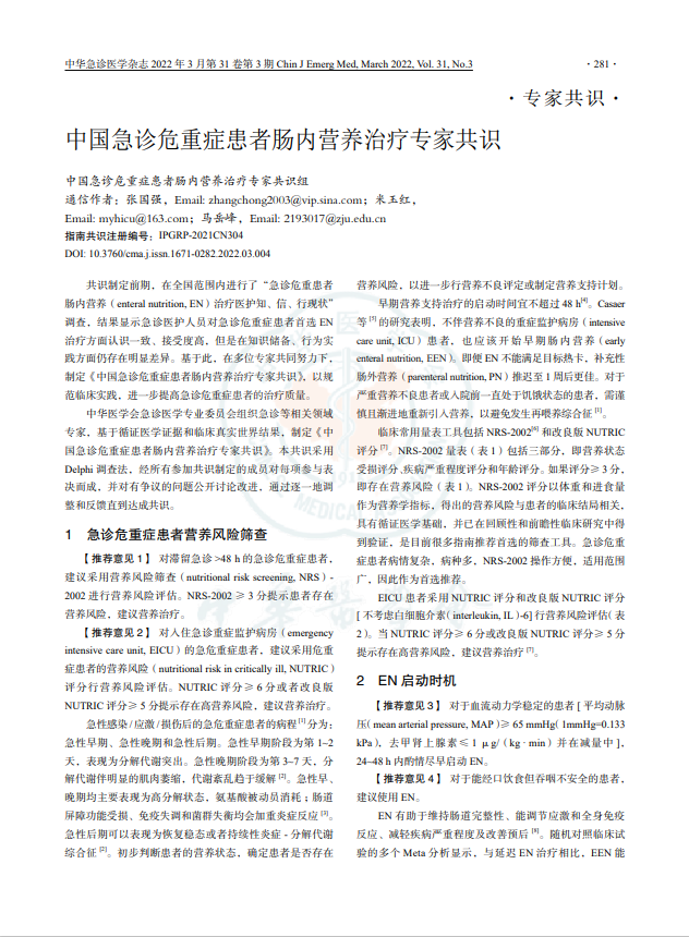 图2《中国急诊危重症患者肠内营养治疗专家共识》
