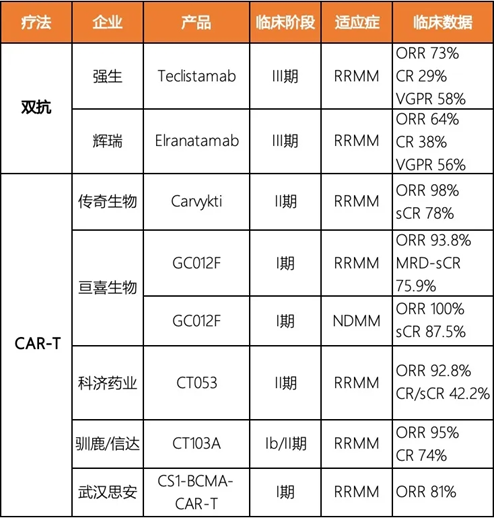 在仅获批一个月后,Teclistamab的多项临床数据继续在ASH年会上公布,包括上市研究的相关分析(MajesTEC‑1,Abstract 97)和新确诊患者的研究进展(Abstract 3242,4558)等。其积极的临床结果,扛起了双抗药物治疗RRMM的大旗。而辉瑞、再生元和BMS也有BCMA/CD3双抗药物的临床数据披露,临床进展最快的辉瑞,有望继强生之后,在这一赛道突出重围。