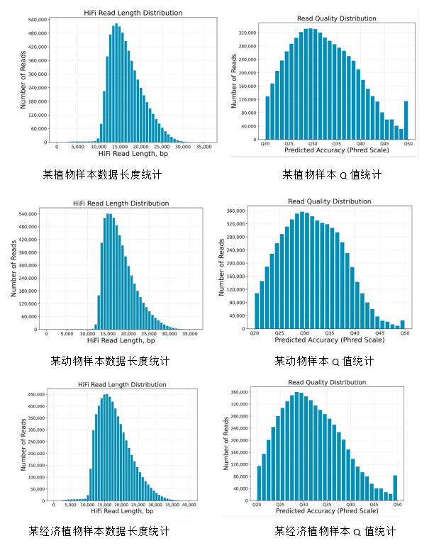 截至目前,百迈客已完成大量动物与植物样本的数据检测。为了更好的看到复杂样本的多样性,这里选取了多样化的测序数据进行展示。从下机数据可以看到,Revio测序整体平均质量值均≥Q30,并且不仅是在动物样本中,就连多种复杂的植物类型里也同样表现出彩!