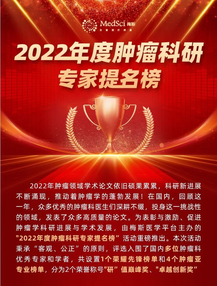 为表彰与激励、促进肿瘤学科研进展与学术发展,由梅斯医学平台主办的“2022年度肿瘤科研专家提名榜”活动重磅推出。本次活动秉承“客观、公正”的原则,评选入围了国内多位肿瘤科优秀专家和学者,共设置1个荣耀先锋榜单和4个肿瘤亚专业榜单,分为2个荣誉称号"研”值巅峰奖、"卓越创新奖”。
