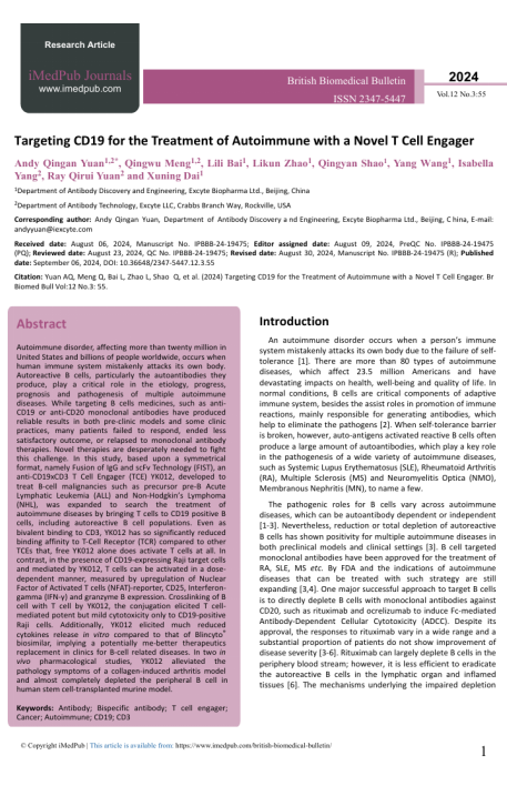 今年8月,YK012临床前数据发表在高水平英文期刊(British Biomedical Bulletin)上,作者为益科思特创始人袁清安、孟庆武领衔的团队,文章介绍了YK012通过特异性靶向CD19/CD3来治疗自身免疫性疾病的相关临床前研究和药物的临床开发潜力。