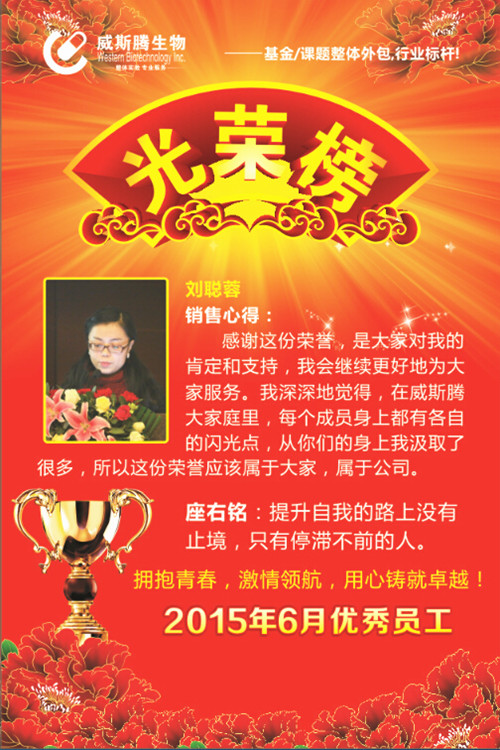2015年7月15日威斯腾生物召开全体会议,对公司6月份优秀员工报价部刘老师进行隆重表彰。公司为了表彰每月工作成绩突出的员工,由全体员工匿名投票,进行评选,最终报价部刘老师高票当选为6月份优秀员工,公司奖励价值1880元的巴西原装进口高级蜂胶一盒。
