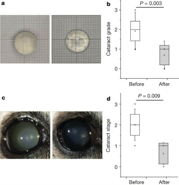 然而,7月22日发表在《自然》杂志上的一项研究中,一个科学家团队和眼科医生们通过在狗中检测一种新的治疗方案发现,含有类固醇的滴眼液能够提高患有白内障狗的晶状体透明度。