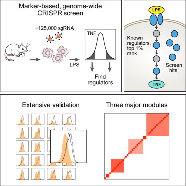 作者们利用分离自表达Cas9转基因小鼠的骨髓源性DCs研究了通过Toll样受体(TLR) 对脂多糖(LPS)产生的天然免疫反应。在用LPS激活DCs后,他们对这些离体细胞进行了全基因组混合CRISPR筛查,基于炎症细胞因子TNF的高水平或低水平蛋白质表达情况分选了这些细胞。这一初期的筛查鉴别出了大多数已知的TNF表达及TLR4信号调控因子,并用单条单向导RNA(Single guide RNA,sgRNA)验证了一些新蛋白。随后,研究人员对排名前列的2,569个基因进行了更深入的二次筛查,以更高的敏感度揭示出了另外一些TNF表达调控因子。