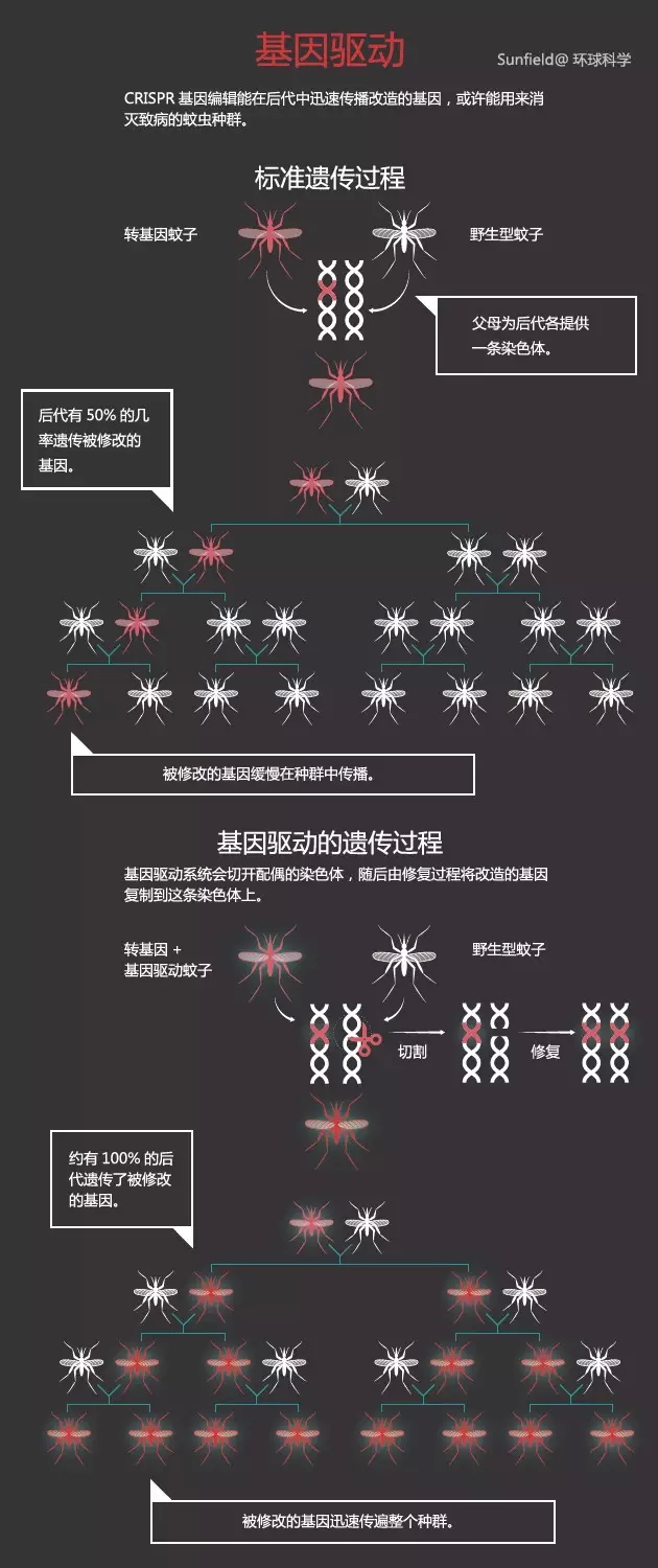 一个物种中的遗传改变往往需要较长时间才能传遍整个种群。这是因为,一对染色体中的一条携带的突变仅仅被被半数后代遗传。然而基因驱动允许通过CRISPR导入单条染色体突变能够在每一代中自我复制到另一条染色体上,结果,几乎所有的后代都会遗传这一改变。这意味着它会以高于正常速度的指数级形式传遍种群(见《基因驱动》)——通过基因改造为蚊子植入的一个突变,就可能在一季时间内传遍一个巨大的种群。如果该突变能使蚊子的后代数量降低,那么蚊群就会与其携带的疟原虫一起灭绝。